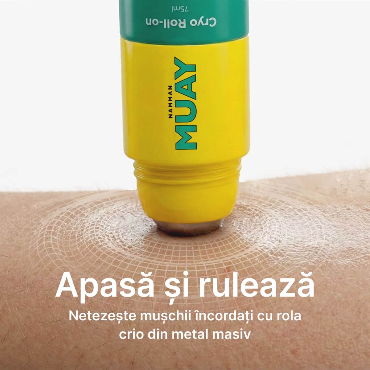 Roll-on-ul Namman MUAY utilizează o bilă metalică de mari dimensiuni pentru a permite detensionarea zonei musculare rigide în timp ce se aplică simultan unguentul.